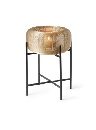 Dieses edle Windlicht vereint modernes Design mit gemütlicher Atmosphäre. Der amberfarbene Glaskorpus mit feiner Struktur sorgt für ein warmes, sanftes Kerzenlicht, das jeden Raum in eine Wohlfühloase verwandelt. Getragen wird das Glas von einem filigranen schwarzen Metallgestell, das für Stabilität sorgt und zugleich einen stilvollen Kontrast bildet.