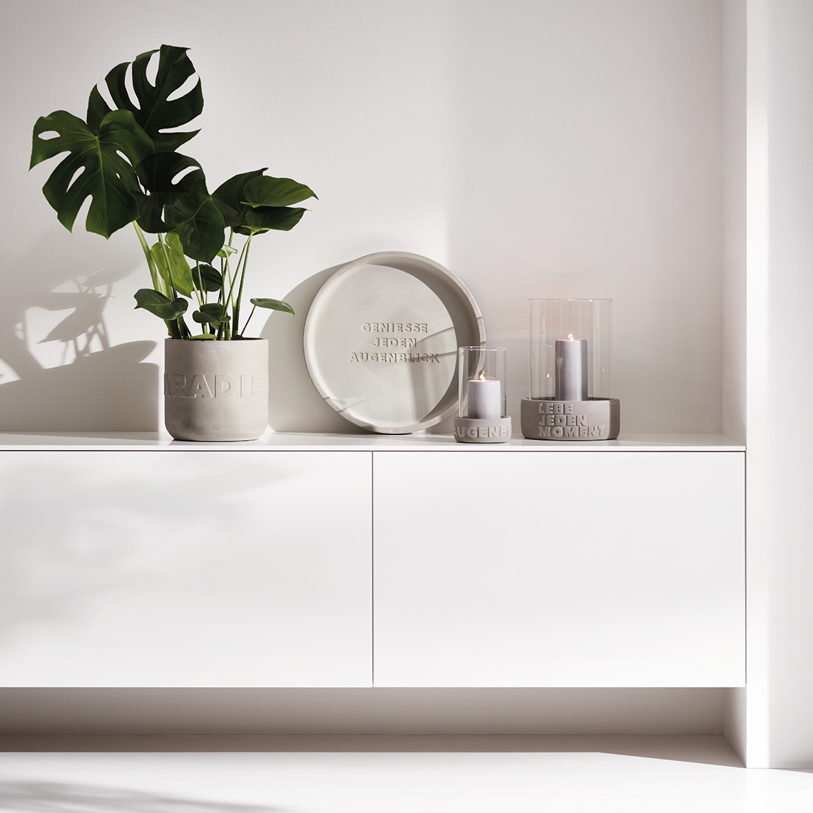 Diese dekorativen Windlichter vereinen modernes Design mit inspirierenden Worten. Der robuste Betonfuß mit erhabener Schrift trägt einen schlichten Glaszylinder, in dem eine Kerze stilvoll ihren Platz findet.